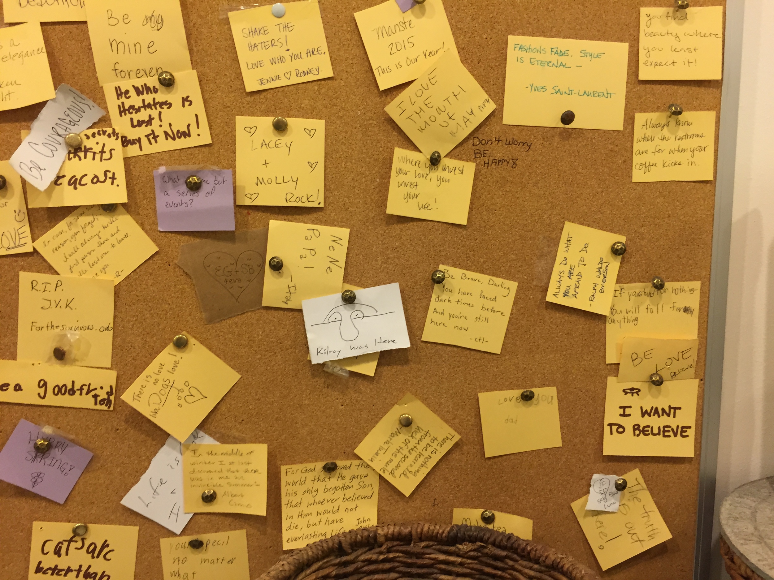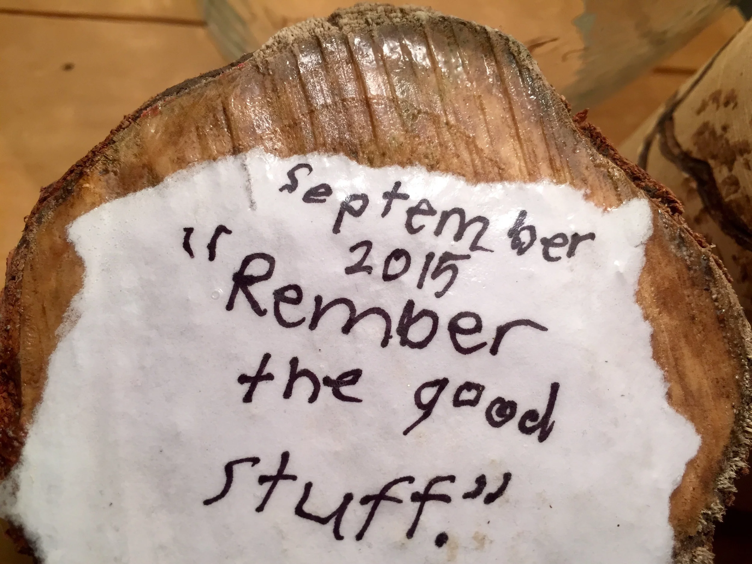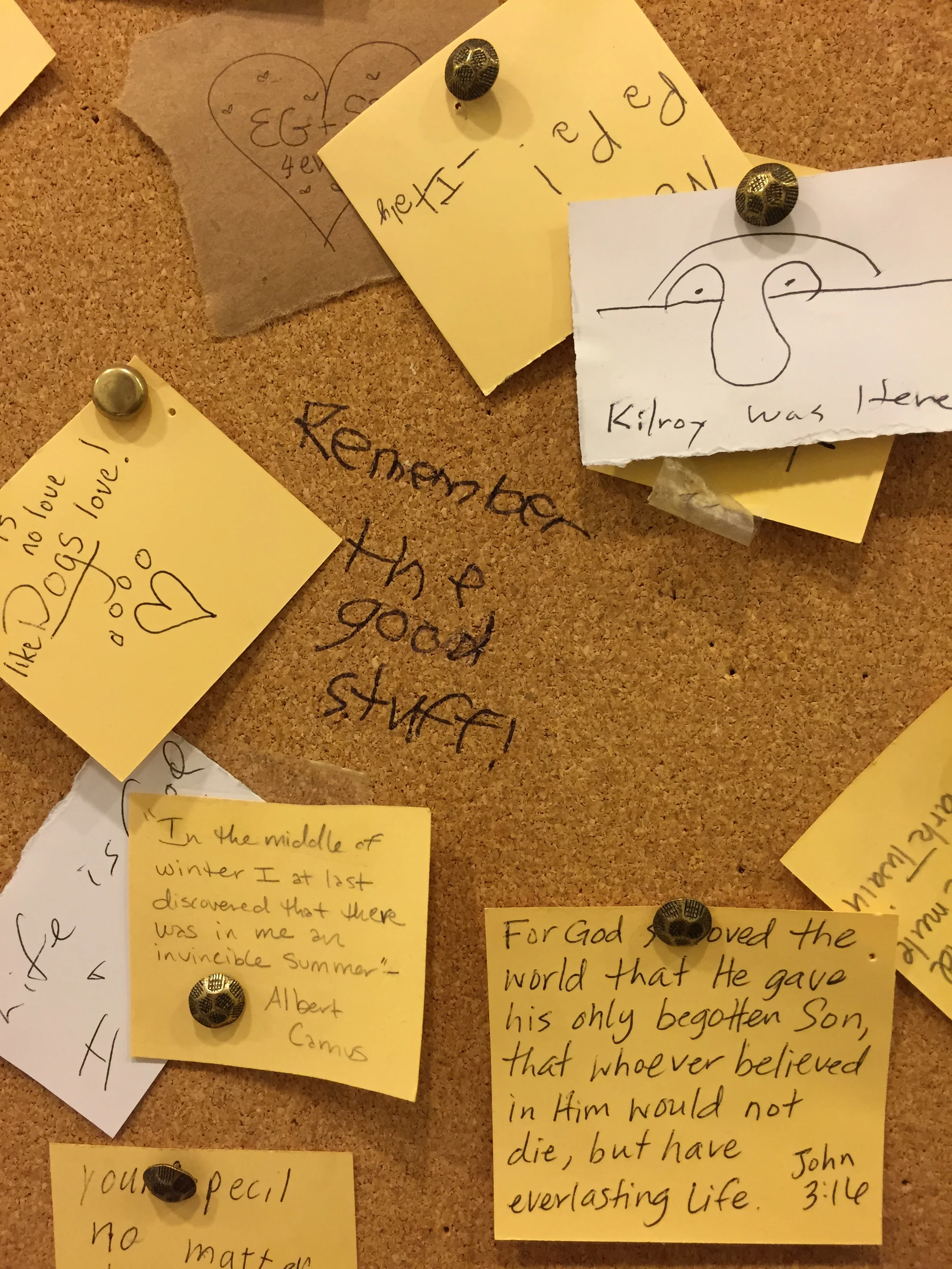 At the start of this month I cruised through to see the most recent additions in the shop—if anything old was new and up for the needing. While there, my daughter headed to use the bathroom, so I followed along, mostly to see if her brother’s post from the month prior remained. I scanned the entries, but I didn't see his handwriting or words among the collection. Just shy of a disheartened departure I saw his graffitied addition among the yellow bits of paper. Either they’d run out of post its or he felt his words worthy enough of an permanent reminder. In ballpoint purpose I read it right there: Remember the good stuff.